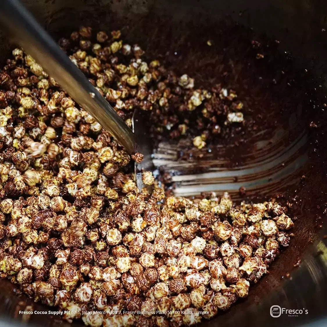Matikan api dan masukkan pop corn dan gaul sekata cepat-cepat. Tapi harini special sikit sebab ramai yang tanya macam mana nak buat coklat kita supaya tak mudah nak cair semasa proses penghantaran. Jangan guna periuk kecil.
